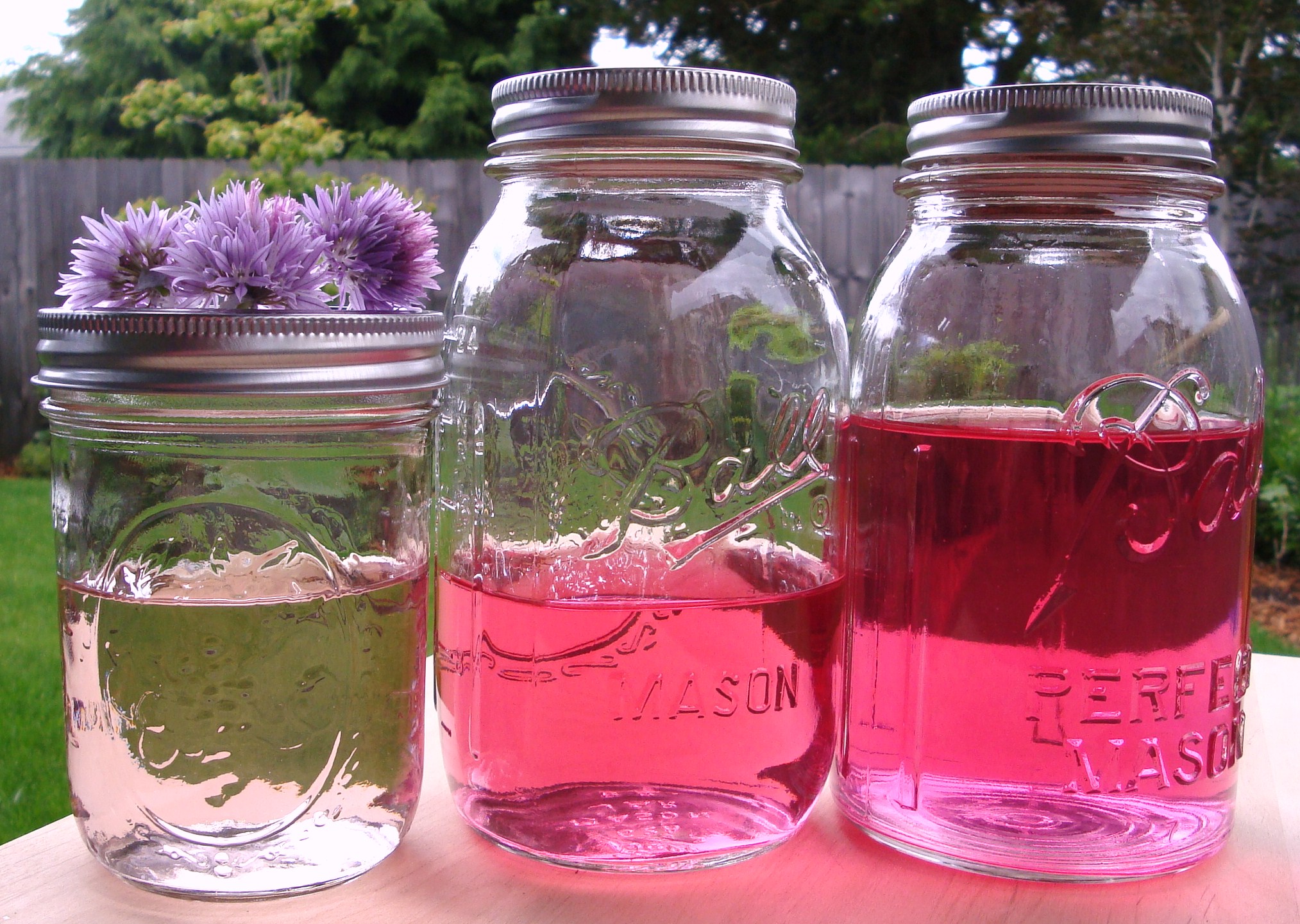 I now have a jar of white wine vinegar infused with chive blossoms, and another jar of distilled white vinegar infused as well. It was very interesting how much more vibrant the vinegar is than the gin/vermouth infusion. The booze infusion is the one that is just faintly pink. For the vinegar infusions, I left the blossoms in for about three weeks.